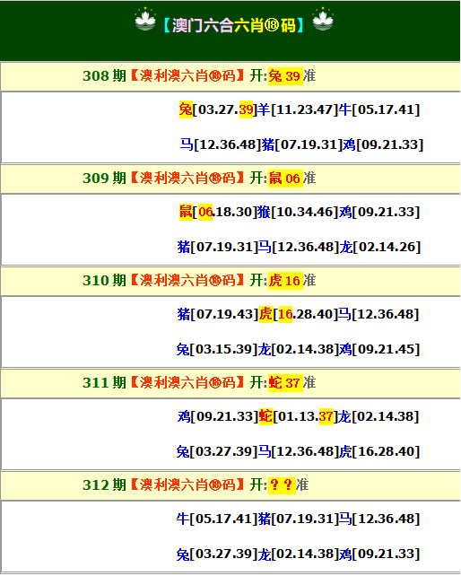 | 308期:单双 | 双数+猪兔 | 开:兔39中 |